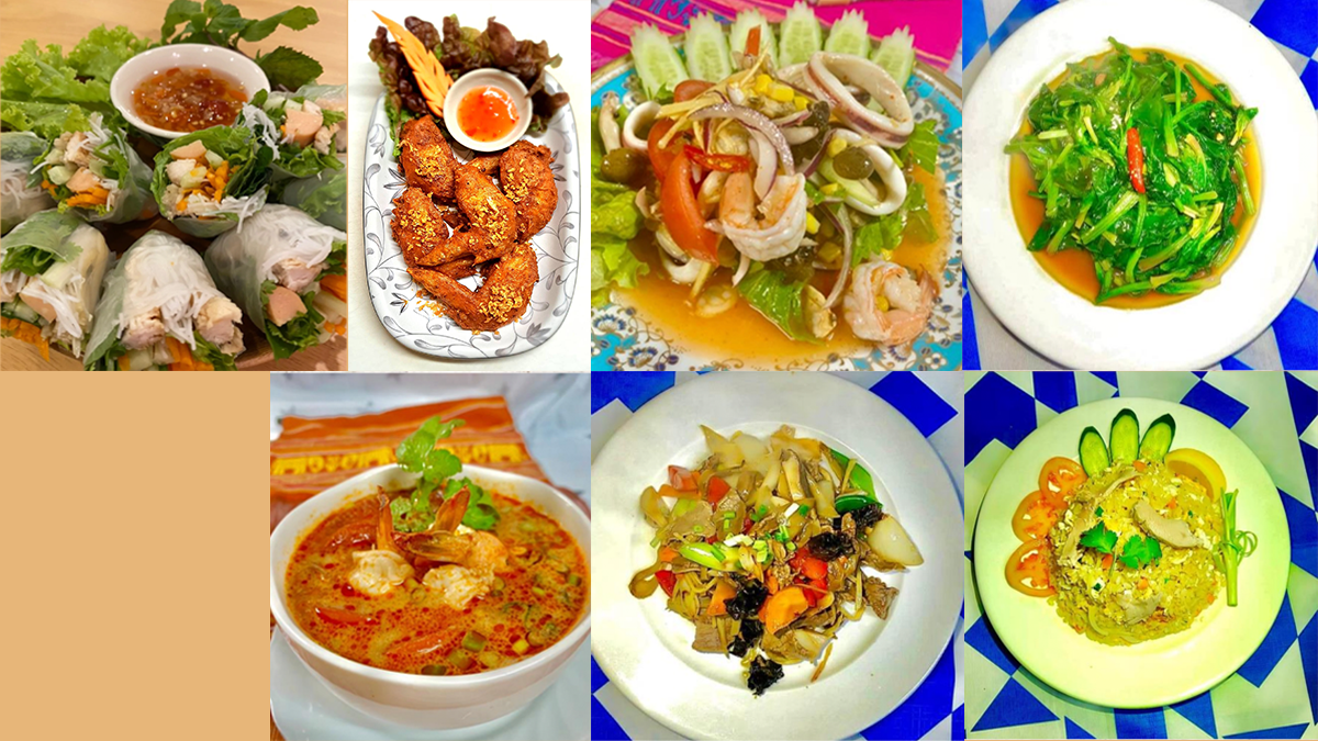 生春巻き・海老揚げトースト・手羽先唐揚げカシューナッツ炒め春雨サラダ or シーフードサラダ空心菜炒め(冬はほうれん草) or 野菜炒めトムヤムスープ(鶏 or エビ or シーフード)辛口チャーハン or チャーハン(鶏 or 豚)