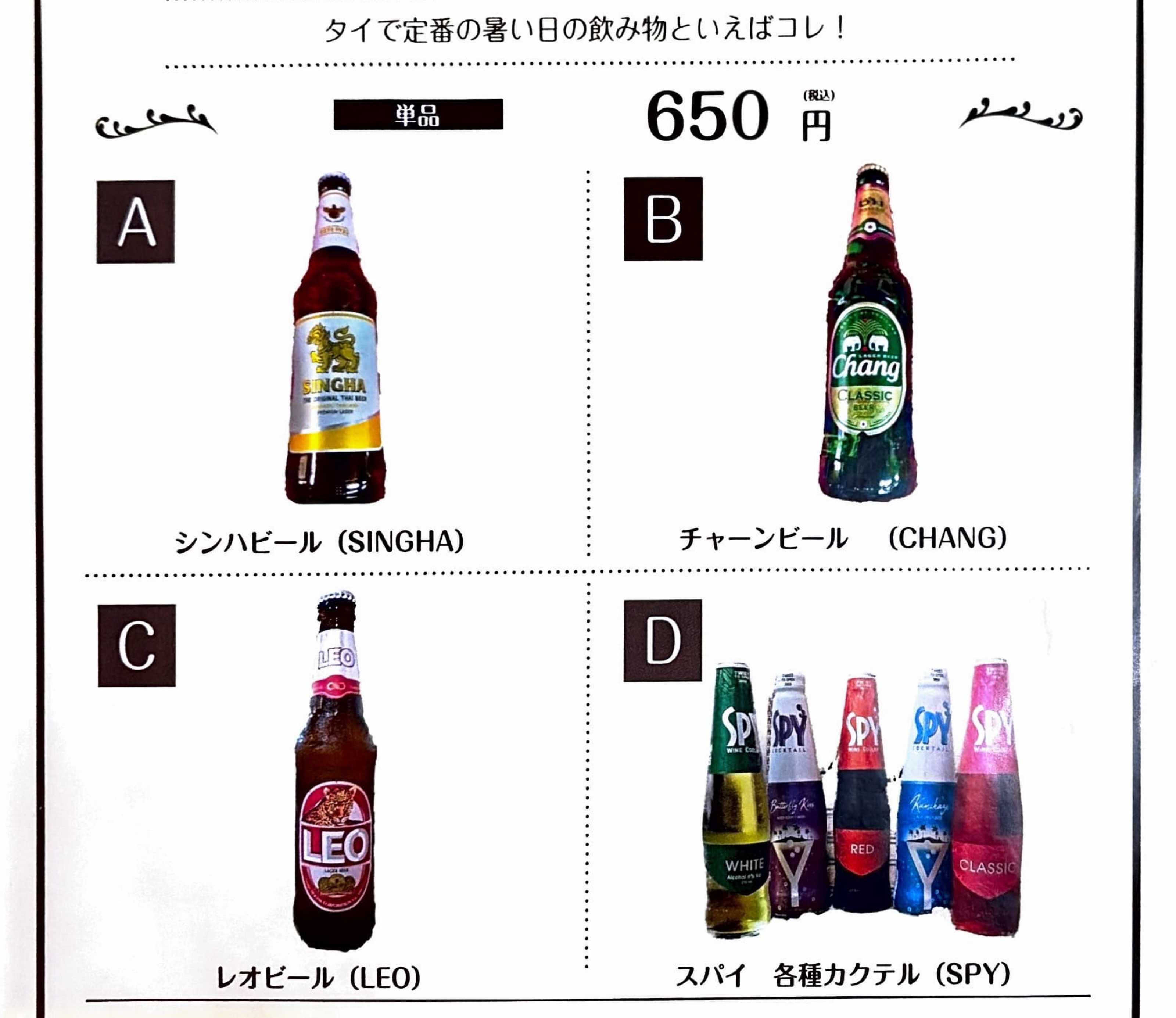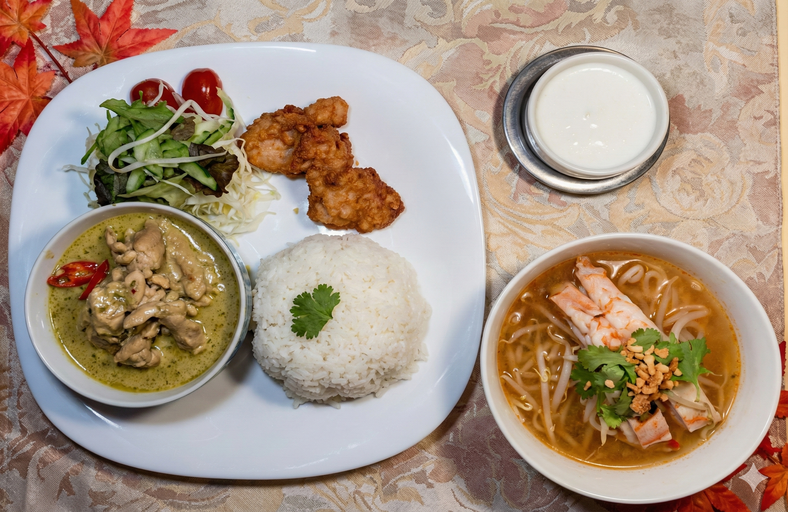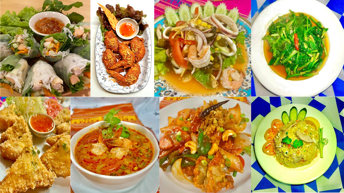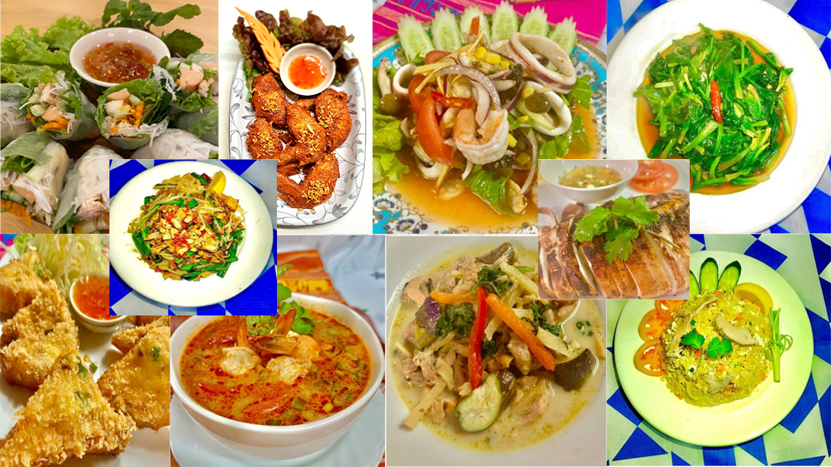 生春巻き・海老揚げトースト・ピリ辛イカ焼鶏皮のパリパリ揚げ・海老焼きそば春雨サラダ or シーフードサラダ or 牛焼肉炒め空心菜炒め(冬はほうれん草) or 野菜炒めトムヤムスープ(鶏 or エビ or シーフード)グリーンカレー or イカ卵カレー辛口チャーハン or チャーハン(鶏 or 豚)