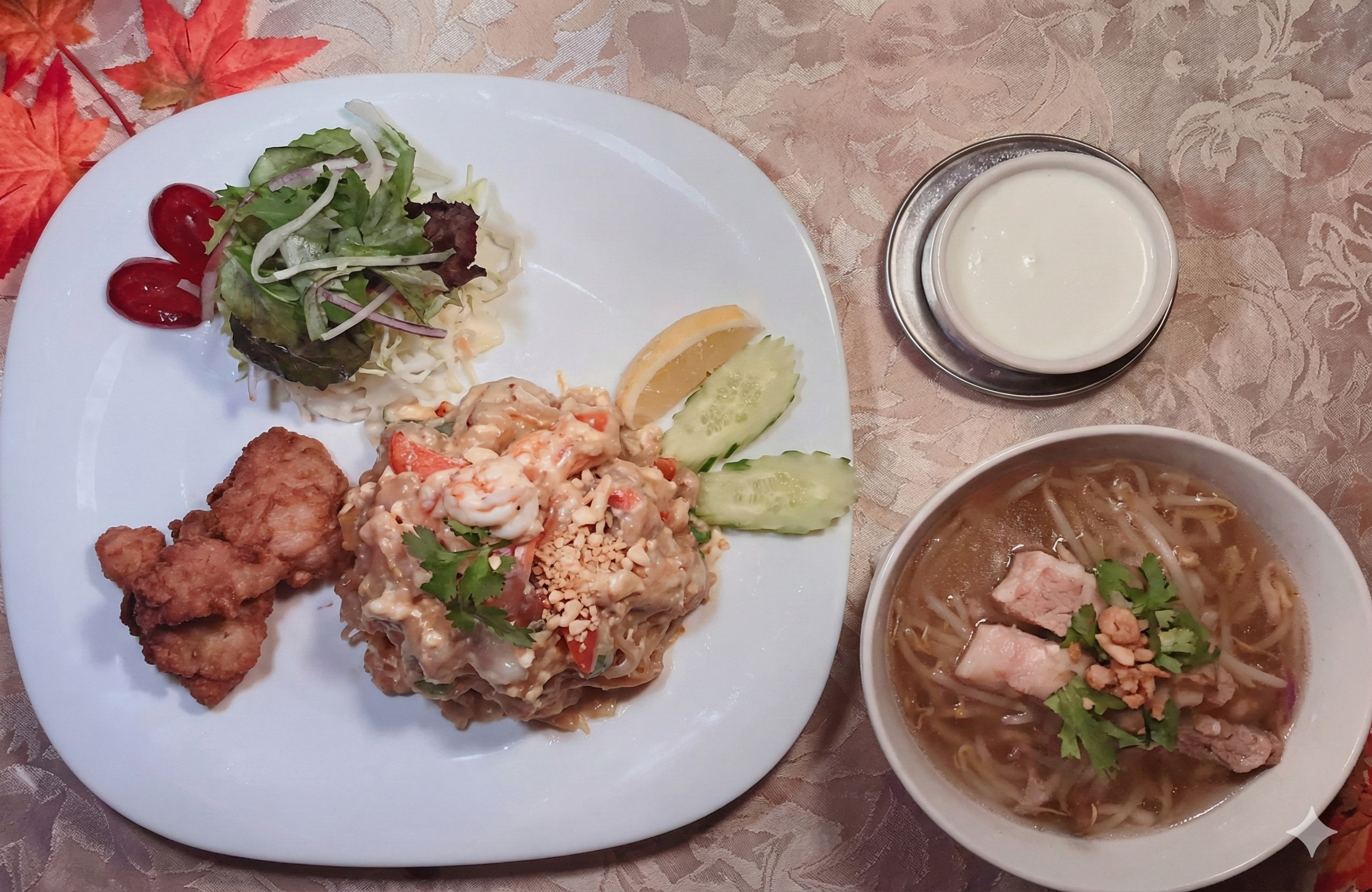 生春巻き・手羽先唐揚げ春雨サラダ or シーフードサラダ空心菜炒め(冬はほうれん草) or 野菜炒めトムヤムスープ(鶏 or エビ)しょうが炒め(鶏 or 豚)・チャーハン(鶏 or 豚)
